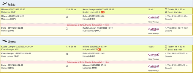 Partenza da Milano/Malpensa alle 16:15 con Qatar Airlines.